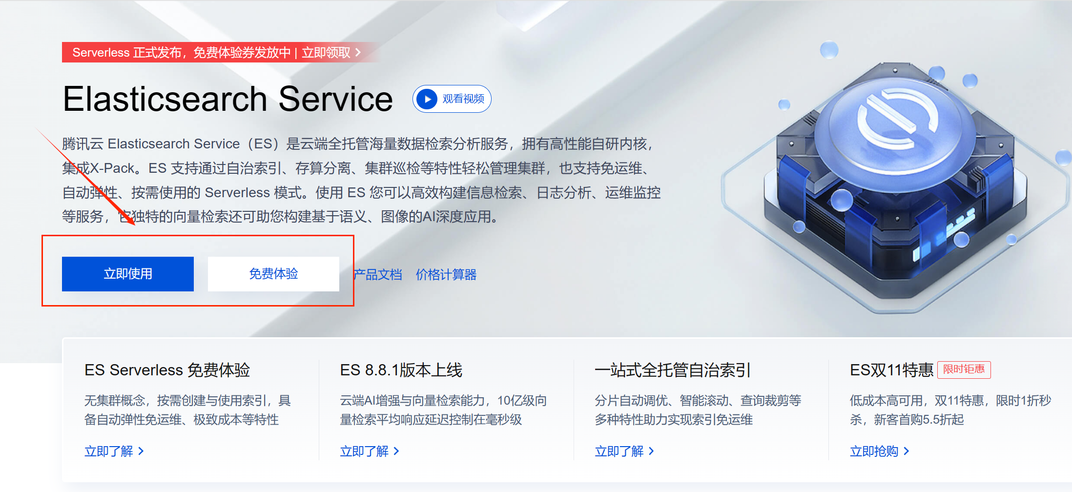 登录腾讯云并跳转到Elasticsearch Service的购买界面,如果下图,然后点击立即使用: