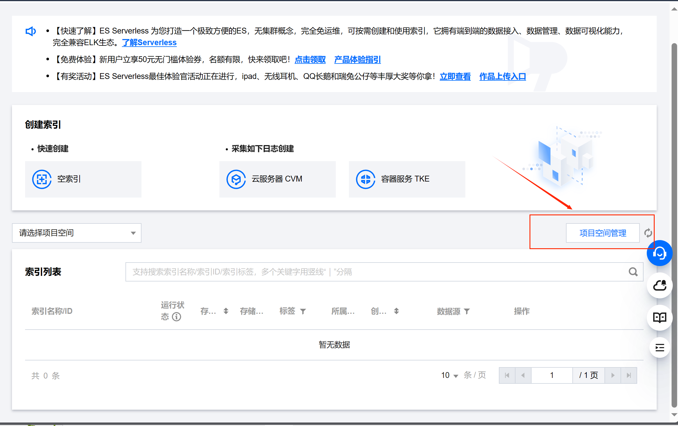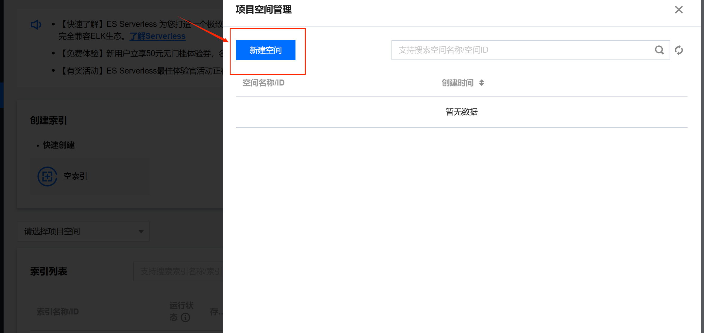 在 Serverless 日志分析首页选择“空索引”,进入索引创建页面。