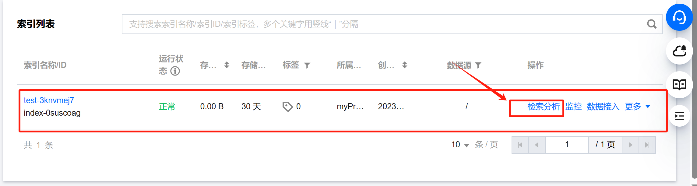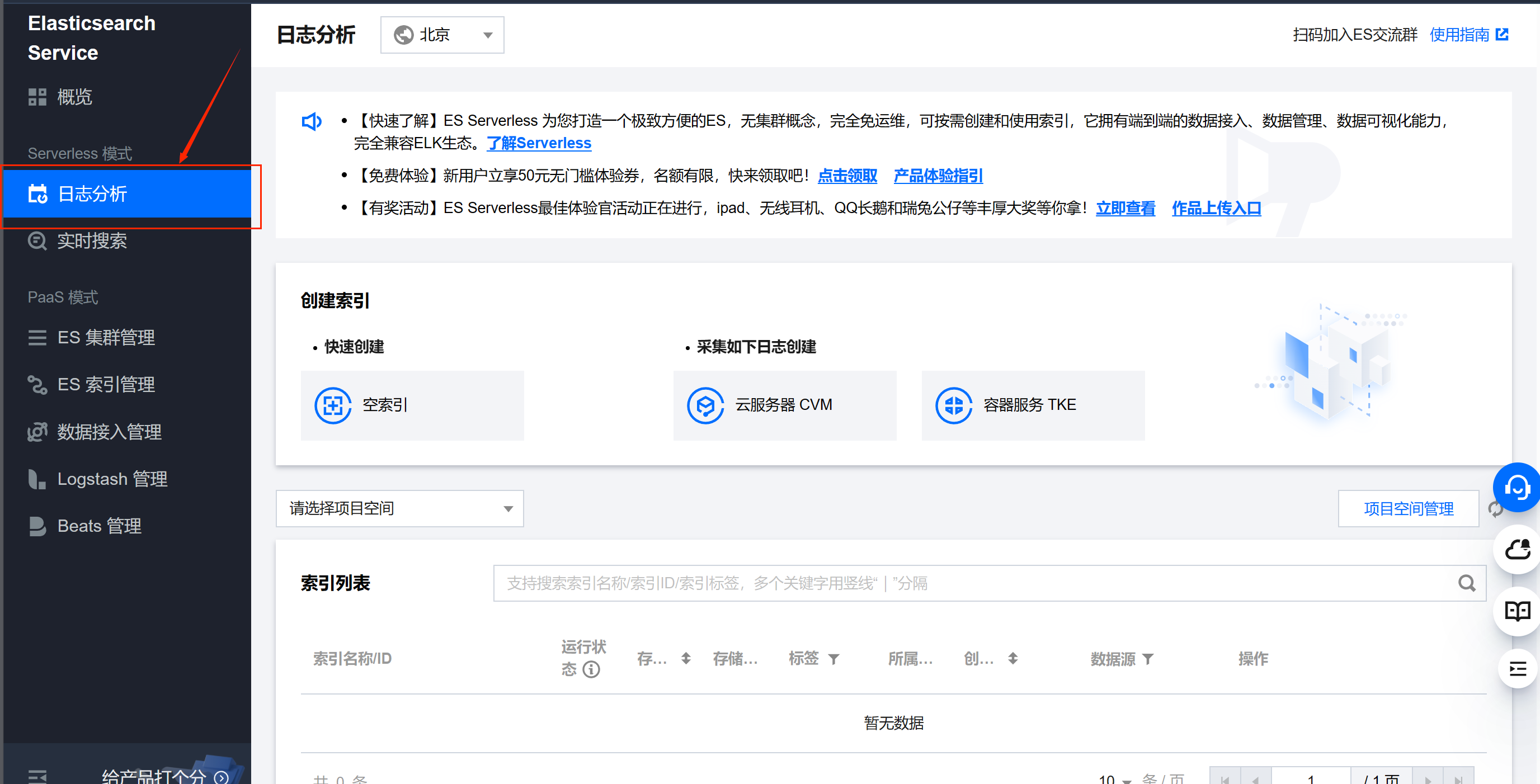 接下来,我们先从最基本的创建索引使用开始体验,在控制台的左侧菜单栏中选择日志分析,进入操作界面