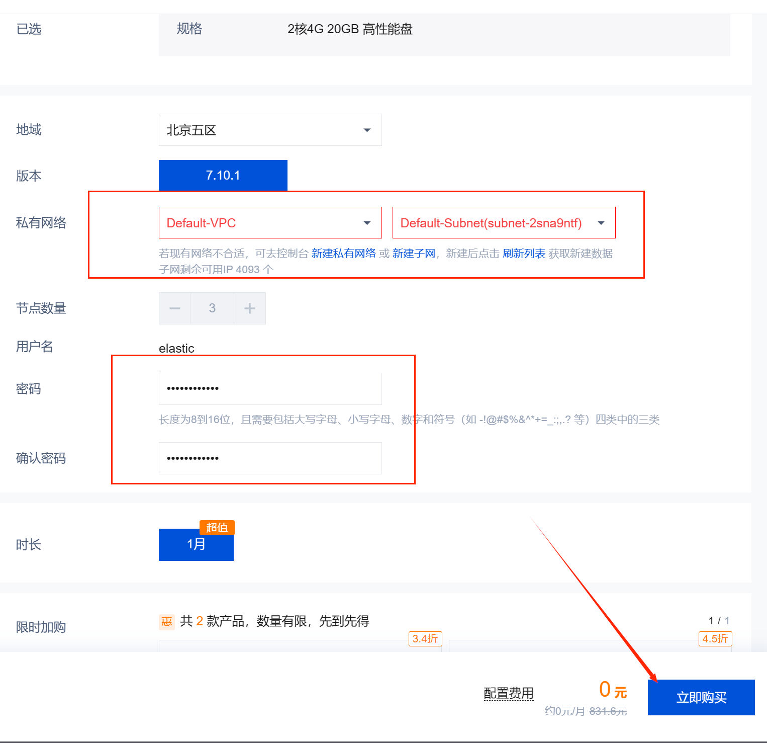 接下来就是进行配置了,主要配置的是私有网络与密码,配置完成以后,然后点击立即购买