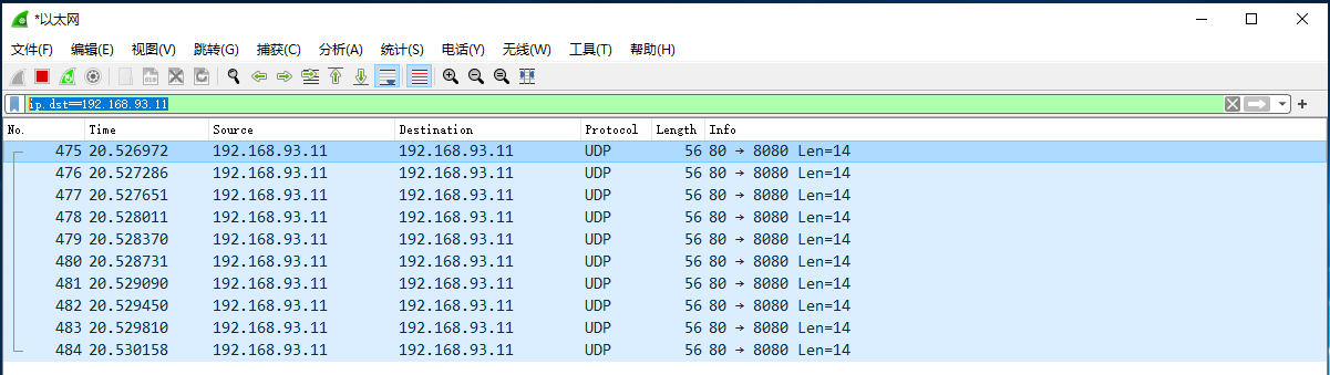 }打开wireshark抓包工具,过滤目标地址为ip.dst==192.168.93.11然后抓包,运行编译后的程序,则你会看到我们自己构建的数据包被发送了10次,如下图所示;