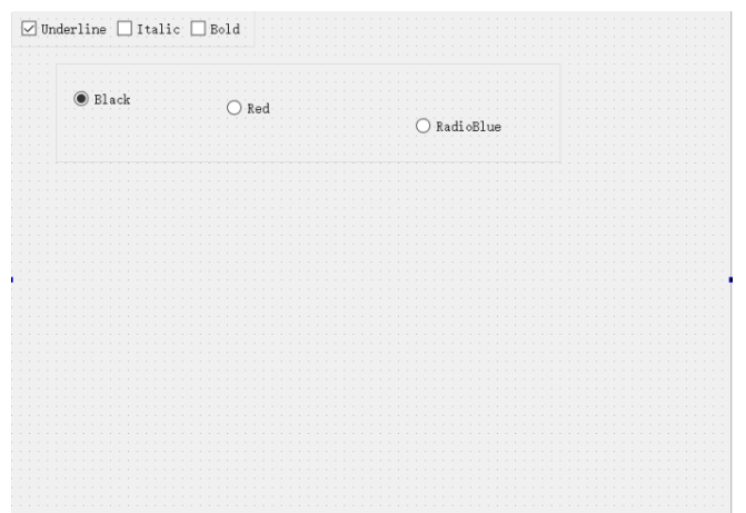 三个Radio Button的ObjectName分别为radioBlack、radioRed、radioBlue,text分别为Black、Red、Blue,其中radioBlack的checked属性打勾