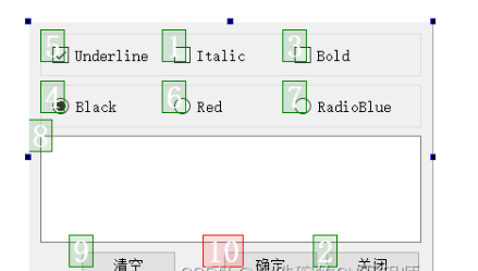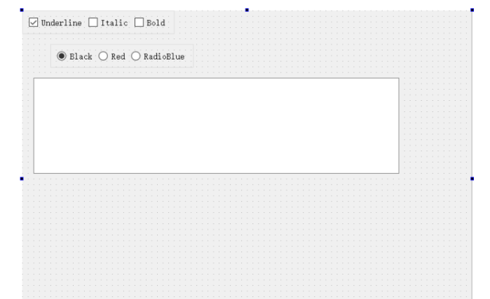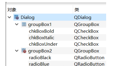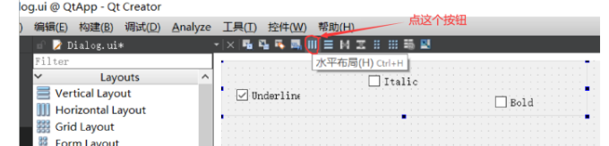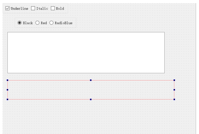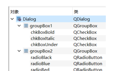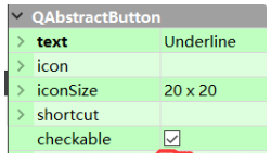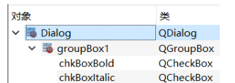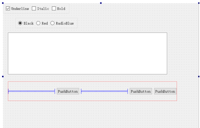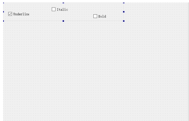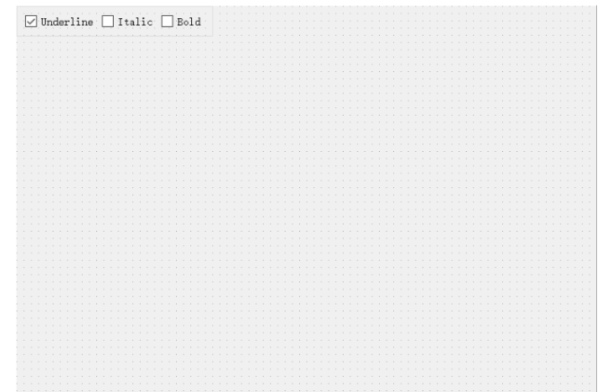 三个CheckBox的ObjectName分别设为chkBoxUnder、chkBoxItalic、chkBoxBold,text分别设为Underline、Italic、Bold,其中chkBoxUnder的checked属性打勾