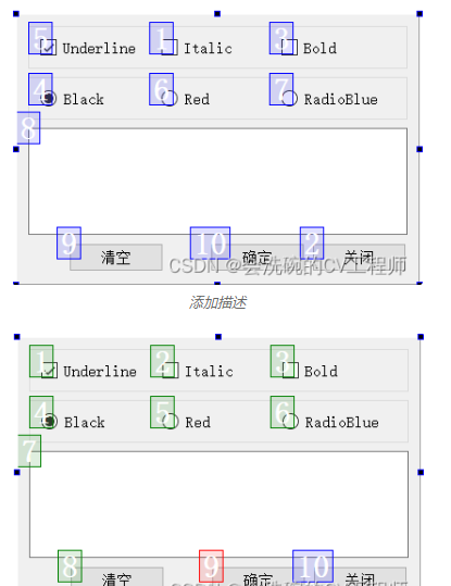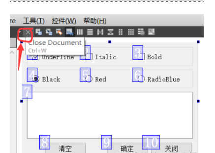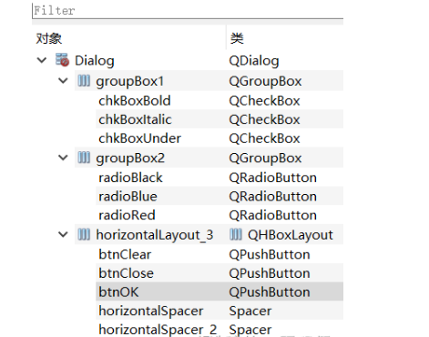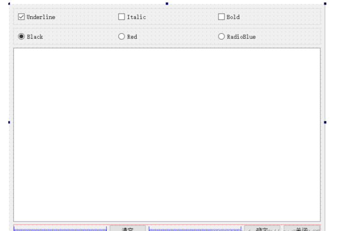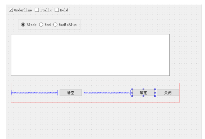 修改三个Push Button的ObjectName分别为:btnClear、btnOK、btnClose,Text分别为“清空”、“确定”、“关闭”