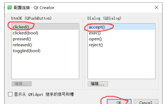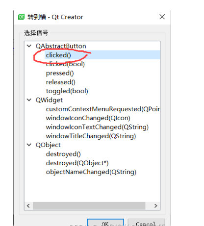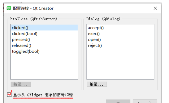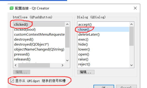 右边没有close按钮,要选显示从QWidget继承的信号和槽