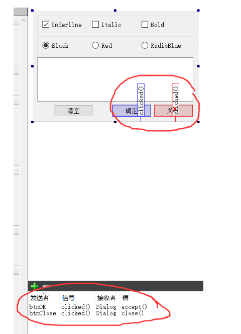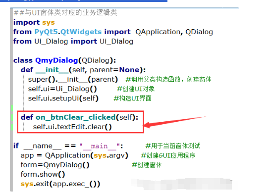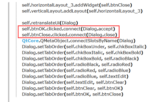 这是因为在QmyDialog的构造函数__init__中创建了窗体类的实例对象self.ui,并调用了setupUi()函数。而SetupUi()函数实现了这两个按钮的信号与窗体相关槽函数的关联。