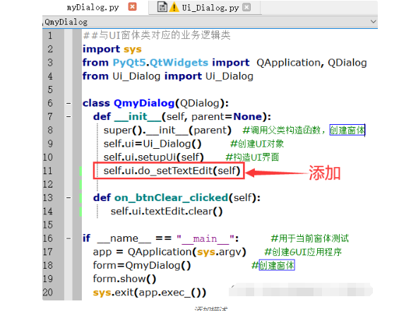 按照界面与业务逻辑分离且界面独立封装的方式定义一个类QmyDialog,保存为myDialog.py。代码如下: