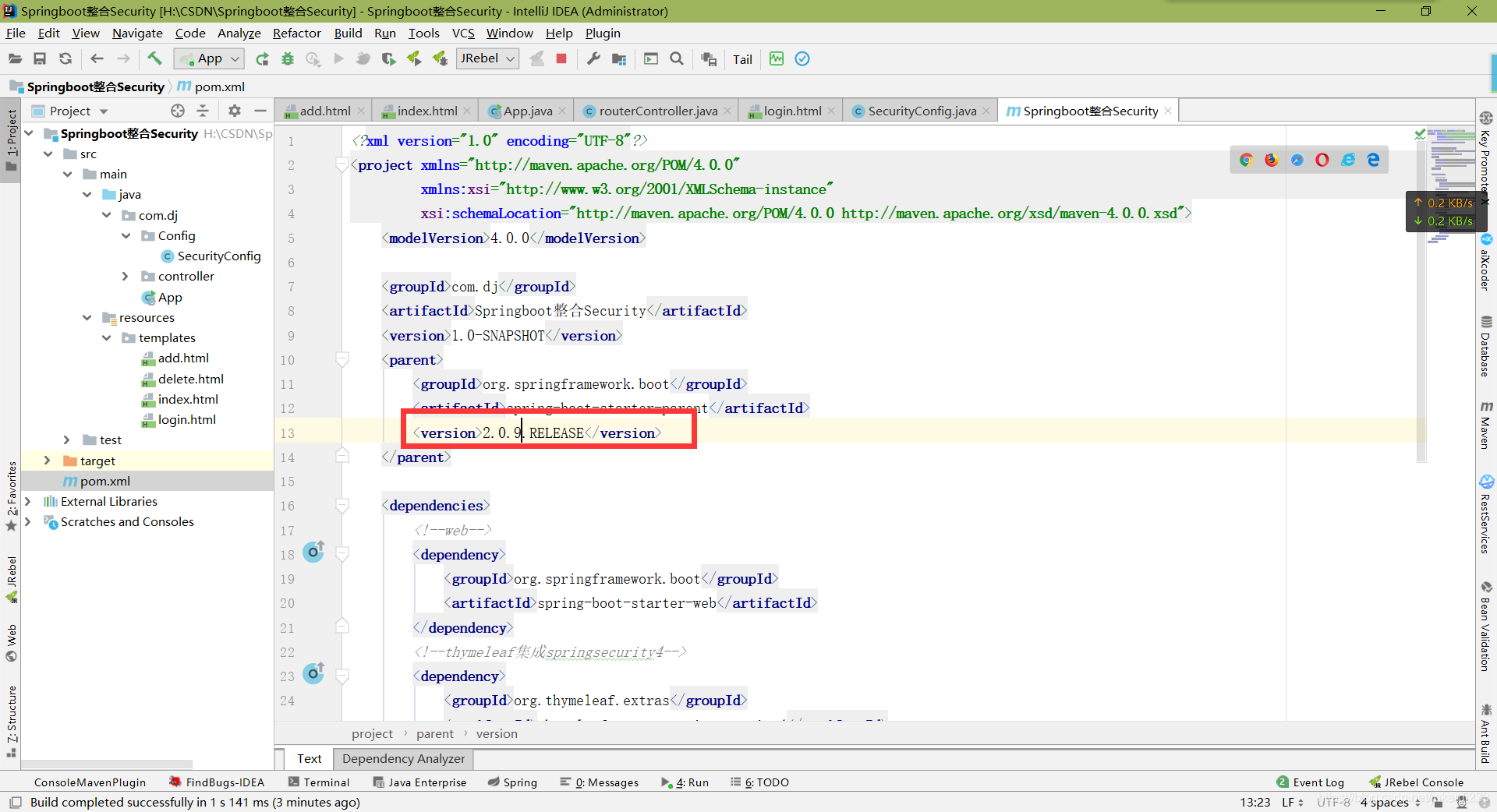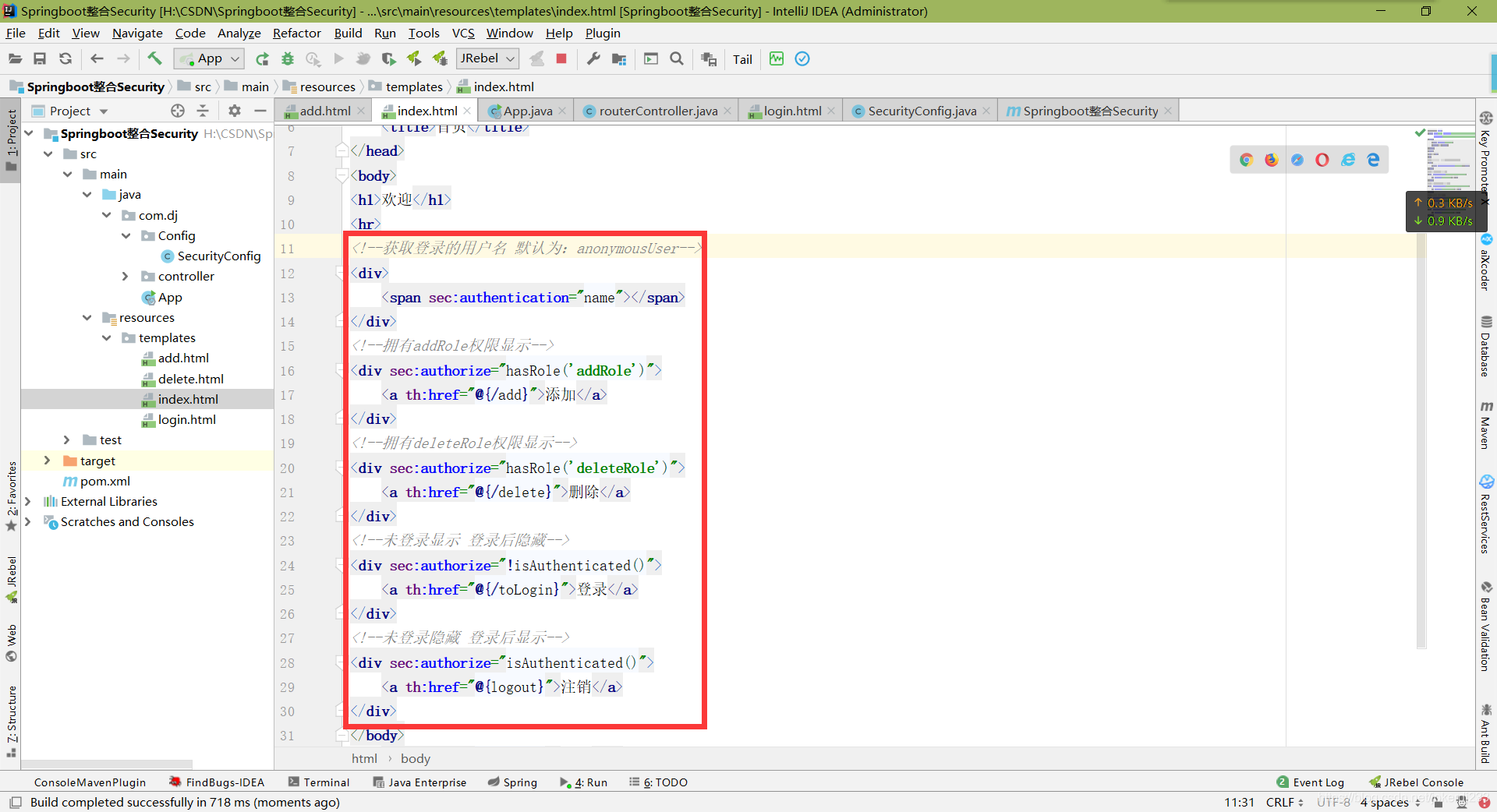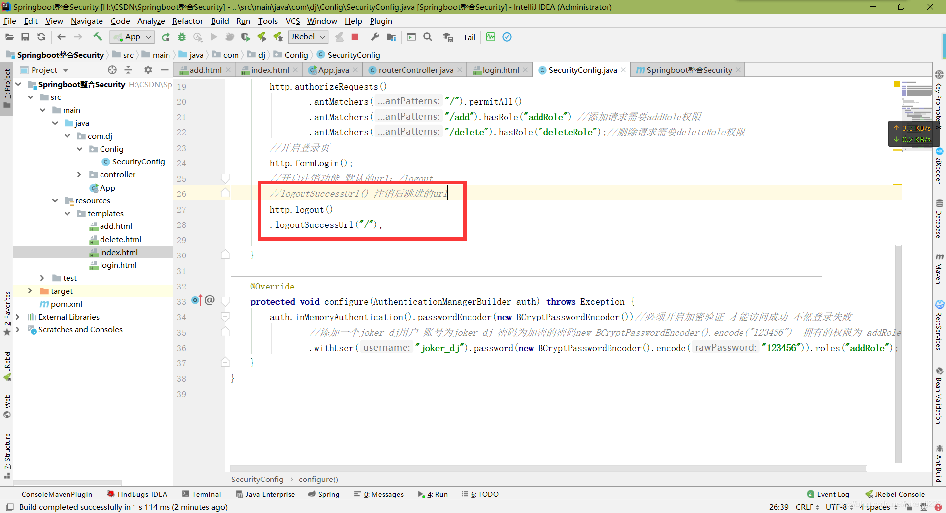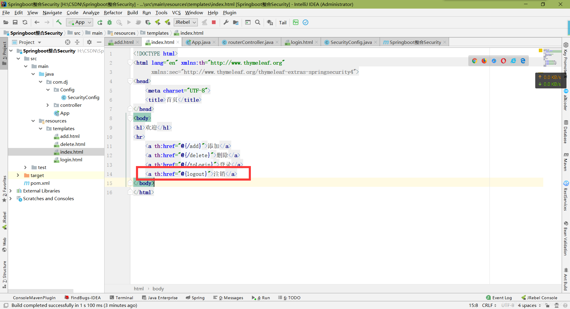 .logoutSuccessUrl("/");注意:springboot2.0.9版本以后的不支持security标签,我们需要下降版本才能看到效果