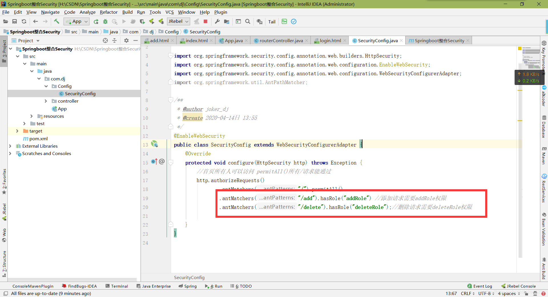 .antMatchers("/add").hasRole("addRole") //添加请求需要addRole权限