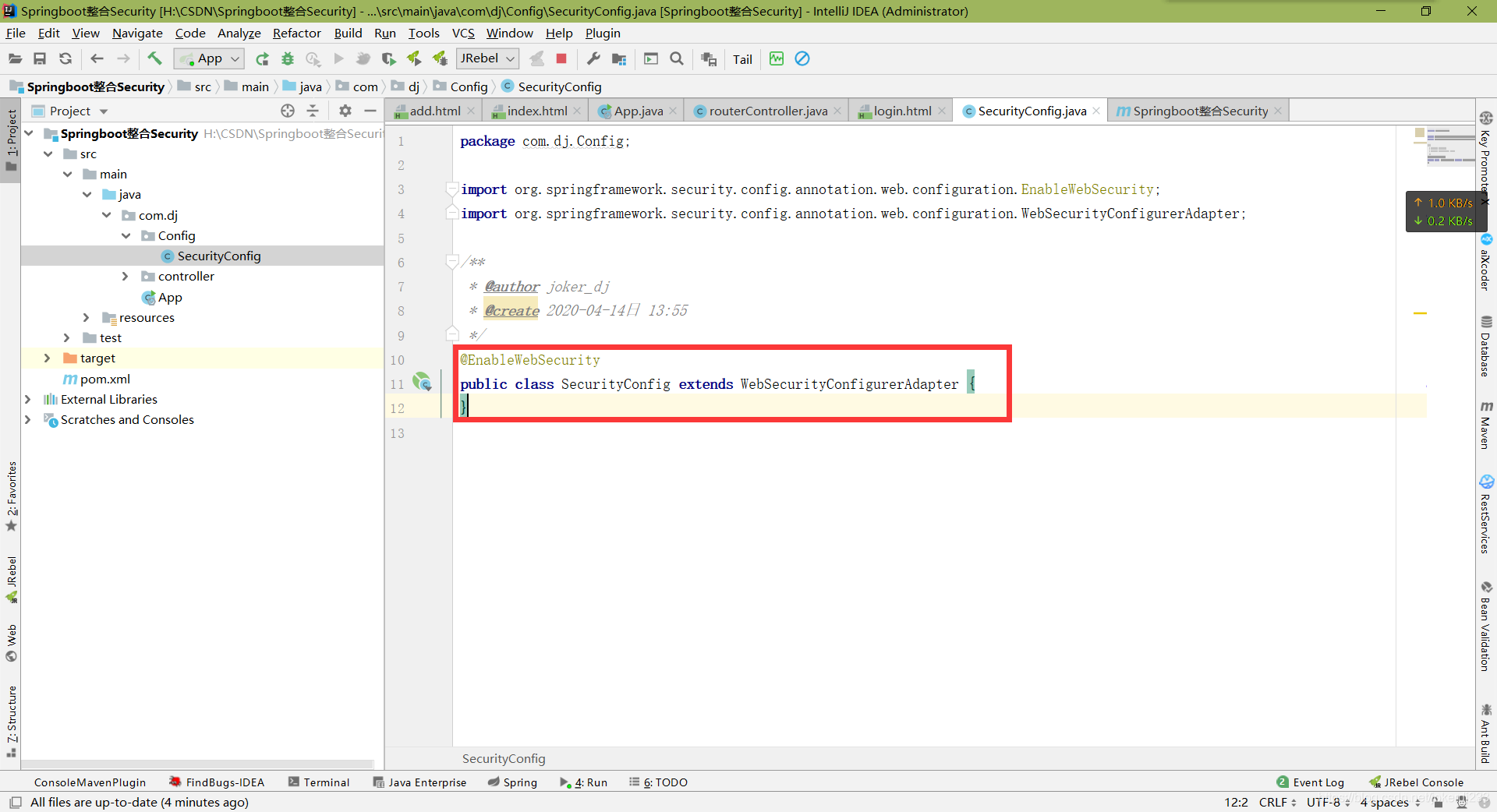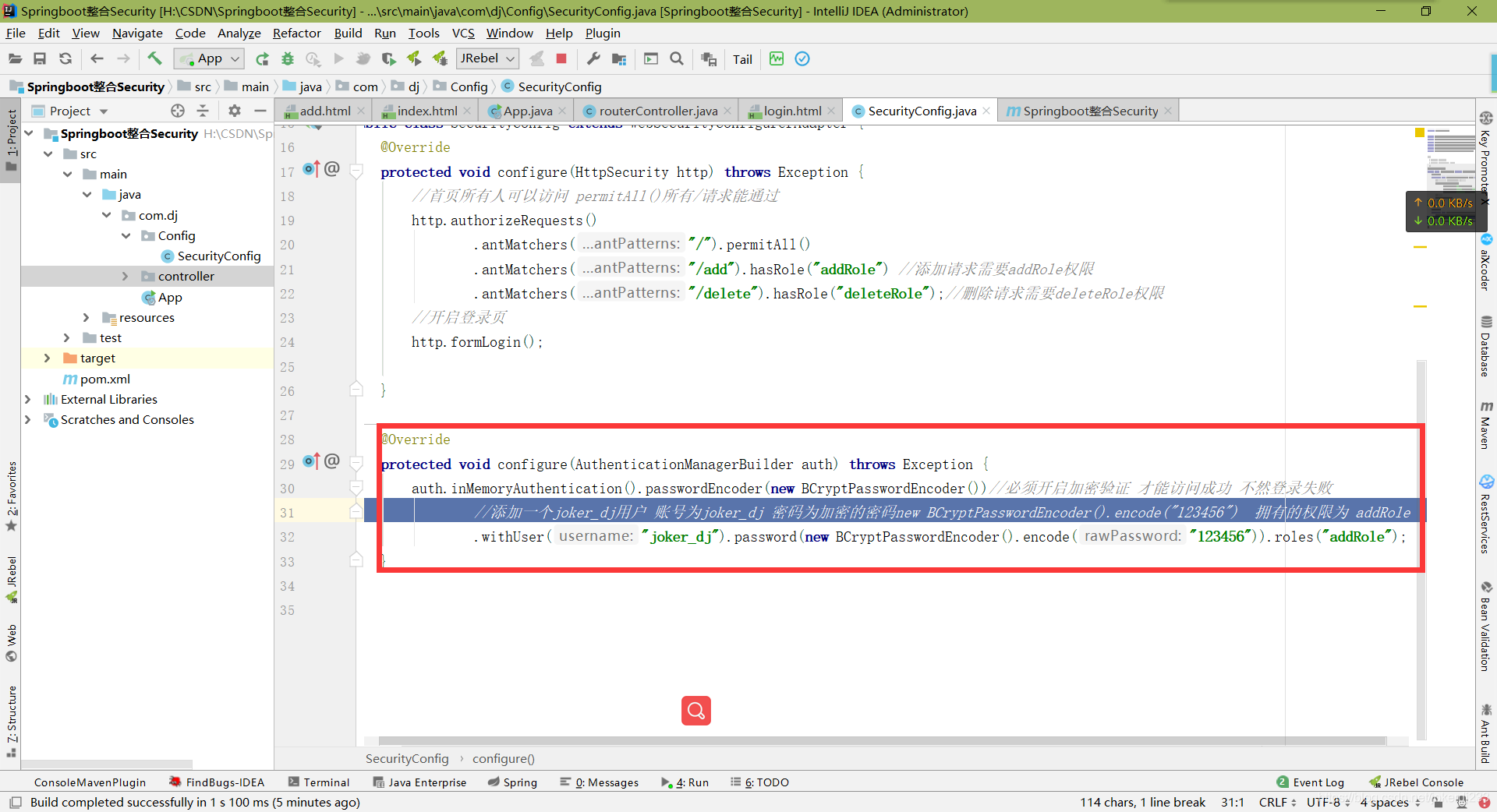 //添加一个joker_dj用户 账号为joker_dj 密码为加密的密码new BCryptPasswordEncoder().encode("123456") 拥有的权限为 addRole