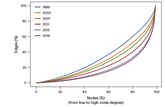作者使用1992年到2020年在arXiv上发布的论文,在类别cs.AI、cs.LG、cs.NE和stat.ML中,创建了一个动态的语义网络。64,719个节点代表从143,000篇论文标题和摘要中提取的AI概念,这些概念是通过快速自动关键词提取(RAKE)获取的,并通过自然语言处理(NLP)技术和自定义方法进行了规范化。作者的目标是构建一个可扩展的方法,适用于任何科学领域。概念形成语义网络的节点,当概念在论文标题或摘要中共现时就会画出相互连接的边。边有基于论文发表日期的时间戳属性,常见的是概念之间有多个时间戳的边。网络是加权的,边的权重代表连接两个概念的论文数量。总的来说,这创建了一个随时间演化的语义网络,如图2所示。发布的语义网络有64,719个节点和17,892,352个独特的无向边,平均节点度为553。许多中心节点的度远远超过这个平均值,如图3所示。观察到随时间网络连通性的变化。尽管度分布仍然是重尾的,但由于流行趋势的影响,尾部内的节点顺序发生了变化。最具连接性的节点以及它们成为这样的年份包括决策树(1994年)、机器学习(1996年)、逻辑程序(2000年)、神经网络(2005年)、实验结果(2011年)、机器学习(2013年,第二次)和神经网络(2015年)。图4中的连通分量分析显示,网络随着时间的推移变得更加连通,最大的研究群体扩大了,而网络整体的连通分量的数量减少了。语义网络揭示了随时间的增加中心化,百分比更小的节点(概念)贡献了更大的边缘(概念组合)部分,如图5显示。这可能是由于AI社区对少数主导方法越来越关注,或者对术语使用的更一致。
