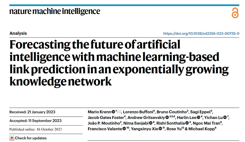 Krenn, M., Buffoni, L., Coutinho, B. et al. Forecasting the future of artificial intelligence with machine learning-based link prediction in an exponentially growing knowledge network. Nat Mach Intell (2023).