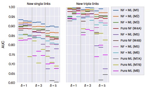 作者展示了预测语义网络中新链接(基于2020年前的数据训练,预测2021年的研究)的各种方法,范围从纯统计学方法到带有手工制作特征(NF)的神经网络,再到不含NF的机器学习(ML)模型。结果显示在图6中,使用NF作为ML模型输入的方法获得了最高的AUC分数。没有ML的纯网络特征也具有竞争力,而纯ML方法尚未胜过那些带有NF的方法。预测至少产生三次的网络链接可以达到AUC > 0.995。