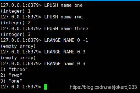127.0.0.1:6379> LPUSH name three # 获取list中值