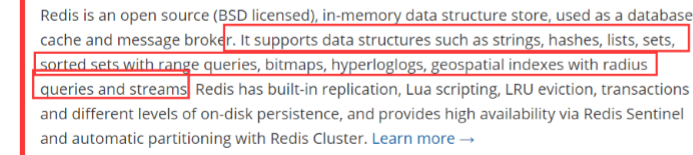 全段翻译: Redis 是一个开源(BSD许可)的,内存中的数据结构存储系统,它可以用作数据库、缓存和消息中间 件MQ。 它支持多种类型的数据结构,如 字符串(strings), 散列(hashes), 列表(lists), 集合 (sets), 有序集合(sorted sets) 与范围查询, bitmaps, hyperloglogs 和 地理空间 (geospatial) 索引半径查询。 Redis 内置了 复制(replication),LUA脚本(Lua scripting), LRU 驱动事件(LRU eviction),事务(transactions) 和不同级别的 磁盘持久化(persistence), 并通过 Redis哨兵(Sentinel)和自动 分区(Cluster)提供高可用性(high availability)。
