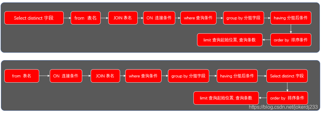 from 表名 ON 连接条件 JOIN 表名 where 查询条件 group by 分组字段 having 分组后条件 select distinct 查询字段 order by 排序条件 limit 查询起始位置, 查询条数