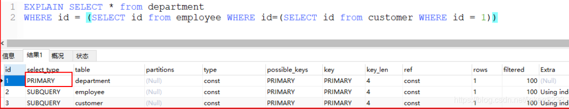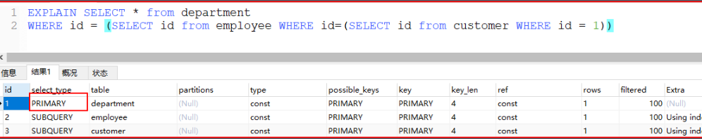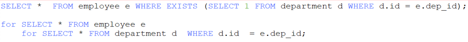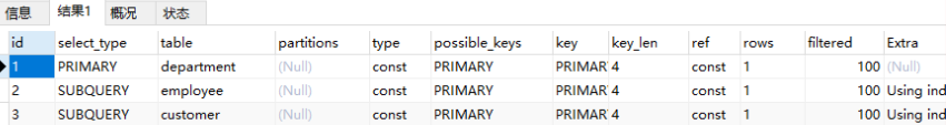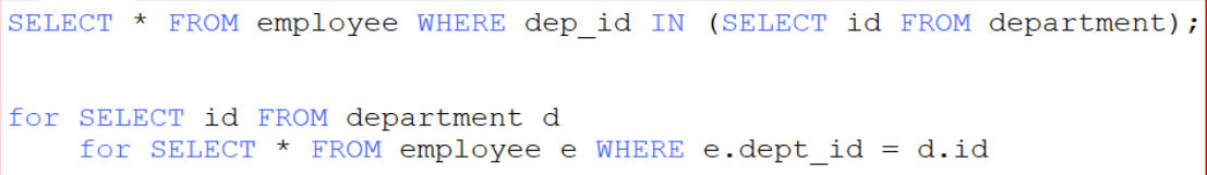 当A 表中数据多于 B 表中的数据时,这时我们使用IN 优于 EXISTS 当B表中数据多于 A 表中的数据时,这时我们使用EXISTS 优于 IN 因此是使用IN 还是使用EXISTS 就需要根据我们的需求决定了。但是如果两张表中的数据量差不多时那么是使用IN 还是使用 EXISTS 差别不大 EXISTS 子查询只返回TRUE 或 FALSE ,因此子查询中的SELECT * 可以是SELECT 1 或者其他