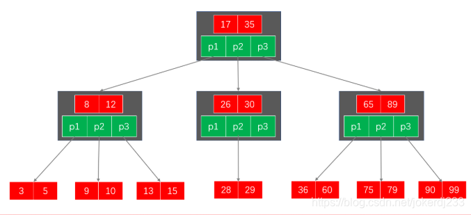 0.根节点至少包括两个孩子 1.树中每个节点最多有m个孩子(m>=2) 2. 除了根节点和叶子节点外,其它每个节点至少有Ceil(m/2)个孩子。 3. 所有叶子节点都在同一层 5. ki(1=1…n)为关键字,且关键字按顺序升序排列k(i-1) < k 8 < 9 6. 关键字的个数n满足:ceil(m/2)-1 <= n <= m-1 (非叶子节点关键字个数比指向孩子的指针少1个) 7. 非叶子结点的指针p[1],p[2],…p[m] 其中p1指向关键字小于k[1]的子树 3 < 8 p[m]指针关键字大于k[m-1]的子树 15 > 12 p[i]指向关键字属于(k[i-1],k[i])的子树 9,10 是位于8 和 12之间