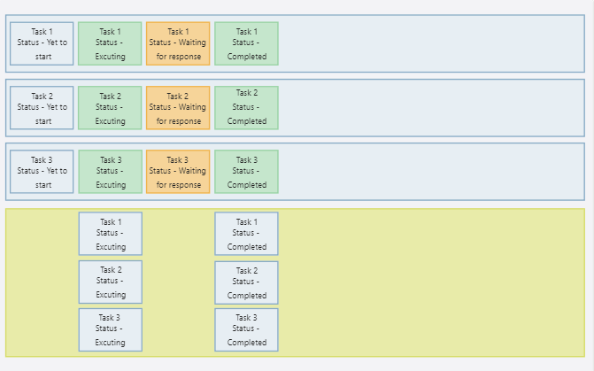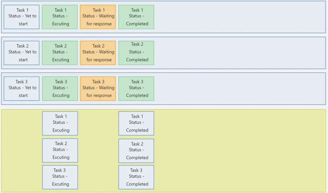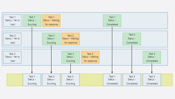 从上面的示意图我们可以看到,所有 3 个任务都开始执行、等待并同时完成各自的任务。但总体速度而言,与并发相比,它花费的时间更少。在资源使用方面,当所有任务都处于空闲状态时,它仍然有带宽来容纳其他任务。通过并行性,我们能够更快地完成工作,但无法更好地利用资源。