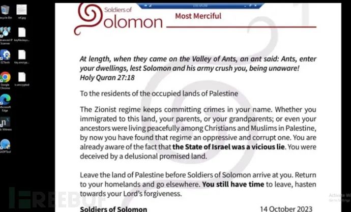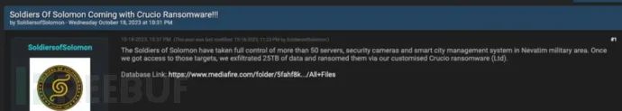 名为 Soldiers of Solomon 的黑客组织也针对以色列的关键信息基础设施进行了大量攻击,该组织声称定制开发了名为 Crucio 的勒索软件。2023 年 10 月 18 日,Soldiers of Solomon 通过 BreachForums 论坛宣布攻击开始。