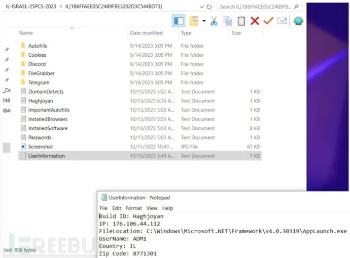 文件 IL-ISRAEL-25PCS-2023.rar 中包含日志格式的数据,意味着攻击者可能使用 Redline Stealer 等恶意软件。