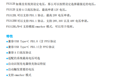 3. 多电压申请:FS312B的不同型号支持不同的电压申请。其中,FS312B可申请的最高电压为12V;FS312BL型号支持PD3.1协议,最高可申请20V电压;FS8025BH型号支持PD3.1协议,可申请28V、36V和48V电压。