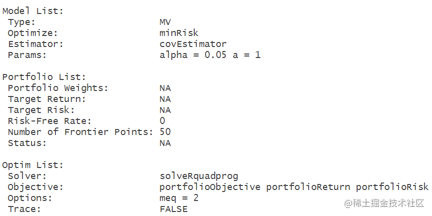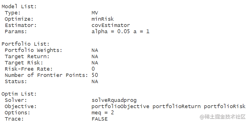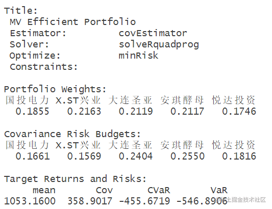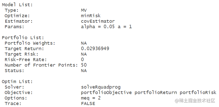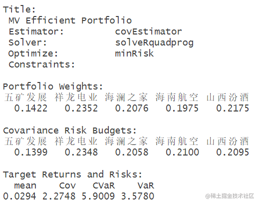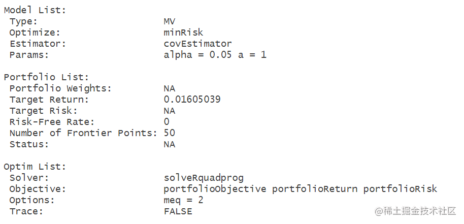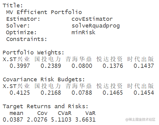 创建了一个对象Spec,并通过平均值设置了目标收益率。Spec包含了投资组合分析的规格和参数。通过mean(colMeans(X))计算出选定列的平均收益率,并将其设为目标收益率。