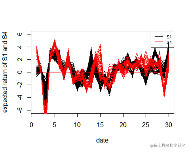 lines(exr, lty = 1, col = 2, lwd = 1)使用lines函数绘制exr的折线图,并指定线型、颜色和线宽。