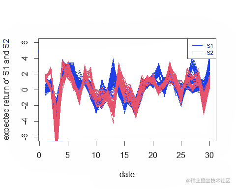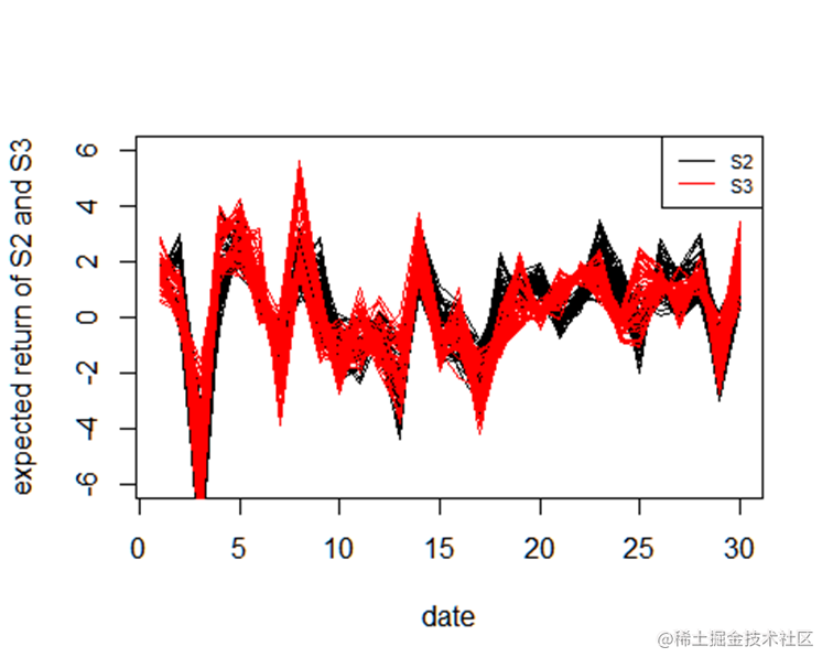 plot(pt,exr ,xlab="date",ylab="expected return of P2 and P3",pch=16,type="l" )