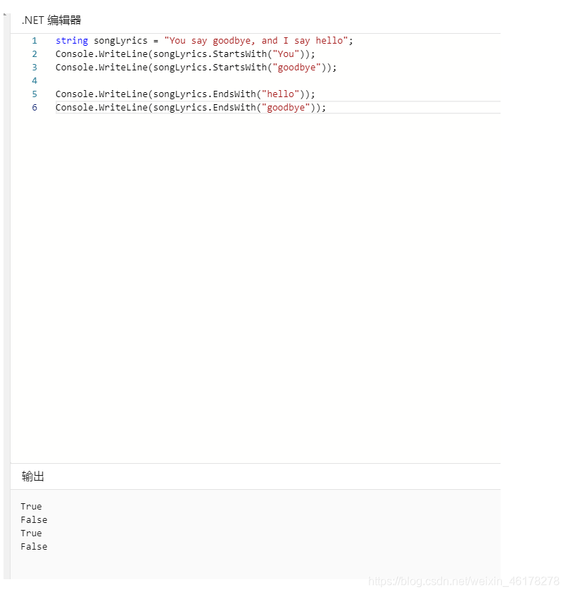 两个类似方法 StartsWith 和 EndsWith,也可以在字符串中搜索子字符串。 这些方法搜索字符串开头或结尾的子字符串。