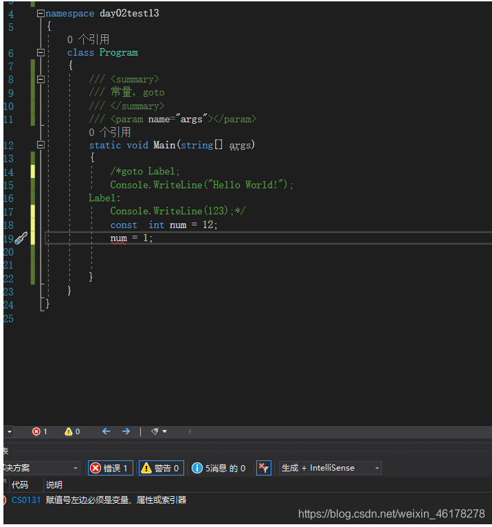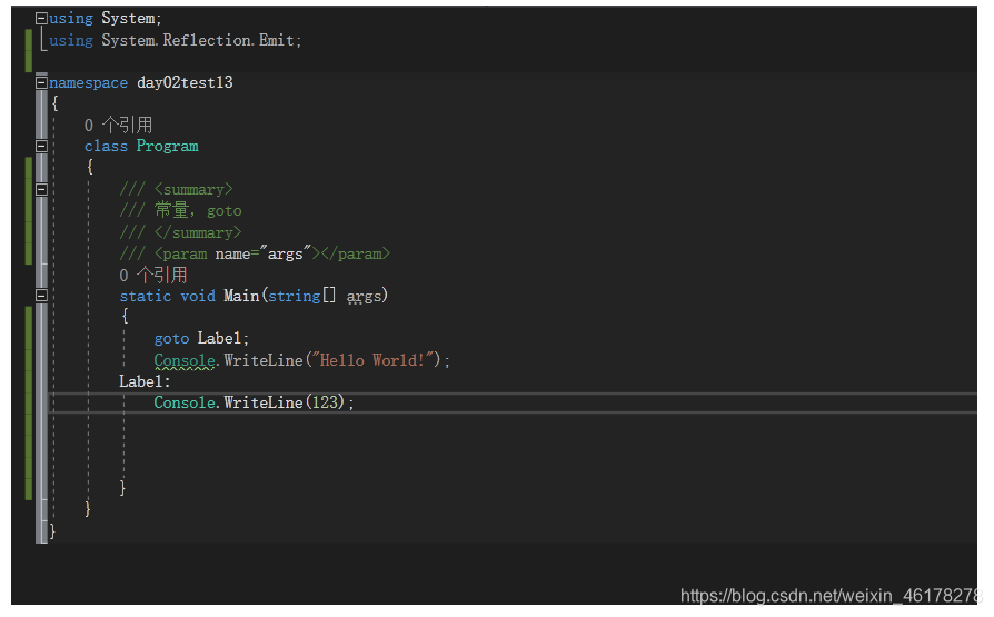 goto 语句,可实现从一个代码块跳到另一个代码块,非常灵活,代码跳跃较大,不便于阅读,所以不建议使用。