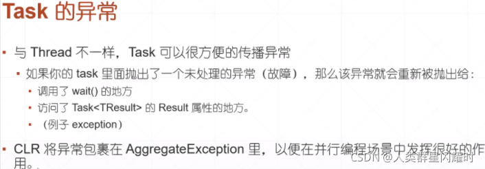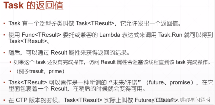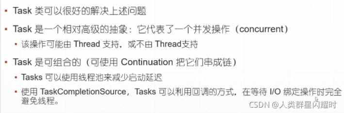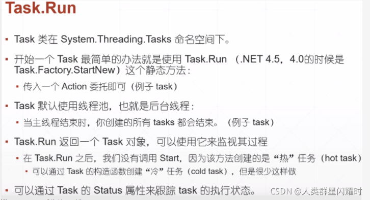 Task 类的表示单个操作不返回一个值,通常以异步方式执行。 通常在线程池线程上异步执行,而不是在主应用程序线程上同步执行,因此可以使用 Status 属性以及 IsCanceled 、 IsCompleted 和 IsFaulted 属性来确定任务的状态。 通常,lambda 表达式用于指定任务要执行的工作。