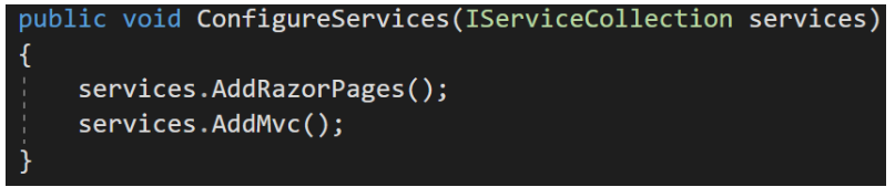 ConfigureServices方法包含IServiceCollection参数,以将服务注册到IoC容器。例如,如果要将RazorPages服务或MVC服务添加到asp.net核心应用程序,则需要将这些服务添加到该方法接受的参数中,如下图所示。