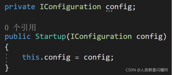 若要访问Startup类中的配置信息,需要使用ASP.NET Core框架提供的IConfiguration服务。 因此,只需要做的只是通过Startup类的构造函数注入IConfiguration服务。