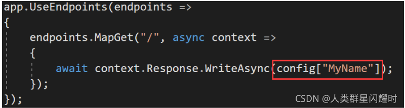 然后,我们使用IConfiguration服务实例访问配置变量,即MyName, 以下代码。