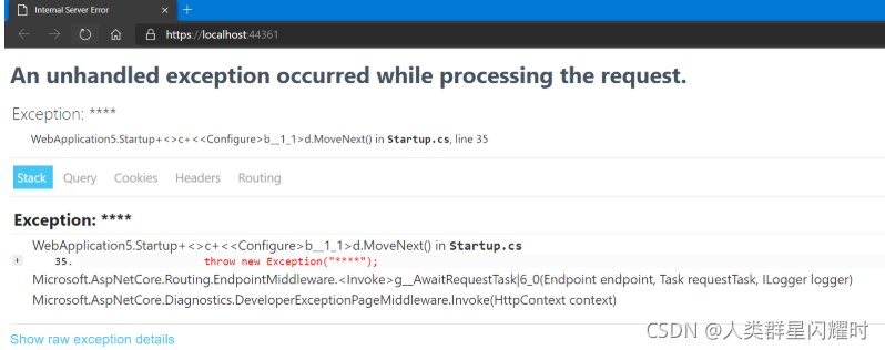 现在运行该应用程序,它将显示以下页面,其中包含有关未处理异常的详细信息。