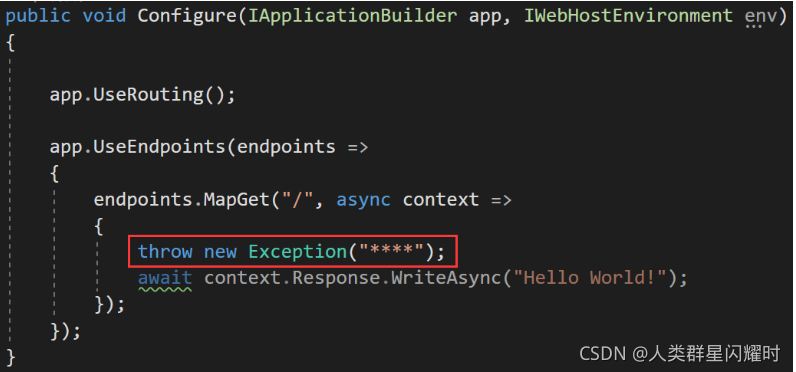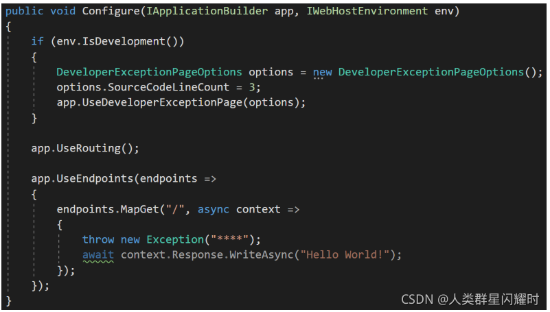 如果希望应用程序显示显示有关未处理异常的详细信息的页面,则需要在请求处理管道中配置开发人员异常页面中间件。为此,请修改Startup类的Configure 方法,如下所示,以添加开发人员异常页中间件,该中间件将处理应用程序中发生的未处理异常。