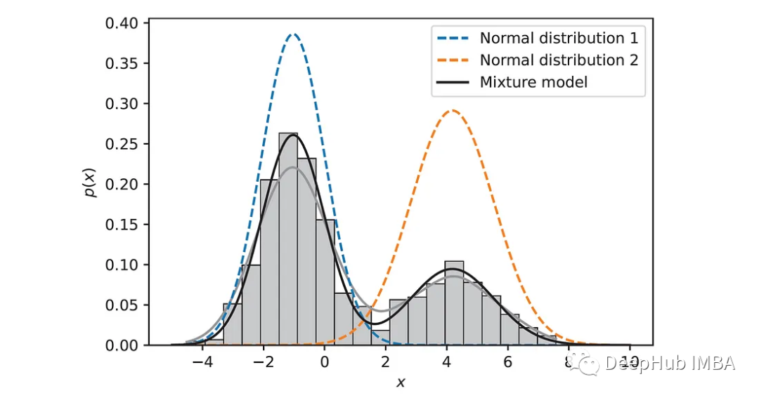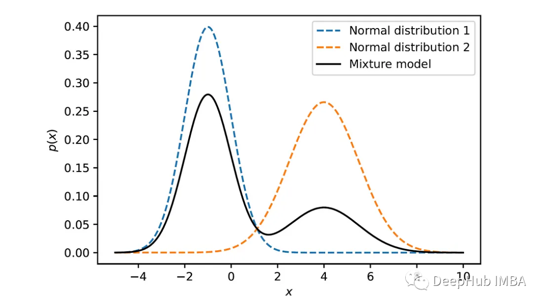 虚线表示单个正态分布,黑色实线表示结果的混合。该图说明了混合模型如何将两个分布组合在一起,每个分布都有自己的平均值、标准差和总体混合结果中的权重。