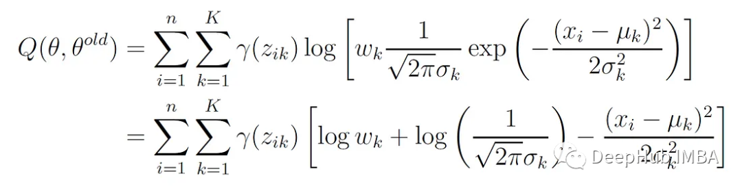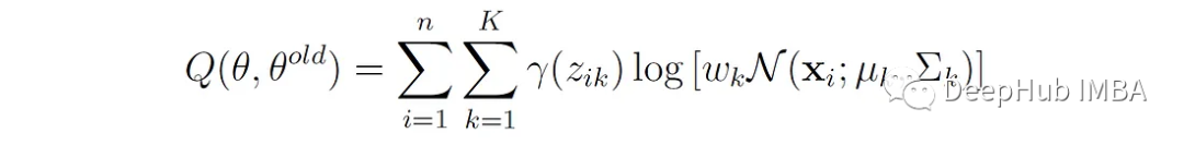 函数Q是每个高斯分量下所有数据点的对数似然的加权和,权重就是我们上面说的responsibilities。Q不同于前面显示的对数似然函数l(θ|X)。对数似然l(θ|X)表示整个混合模型下观测数据的似然,没有明确考虑潜在变量,而Q表示观测数据和估计潜在变量分布的期望对数似然。