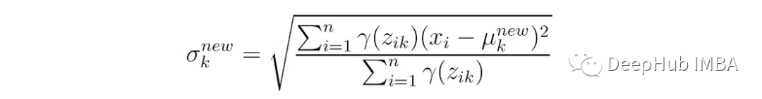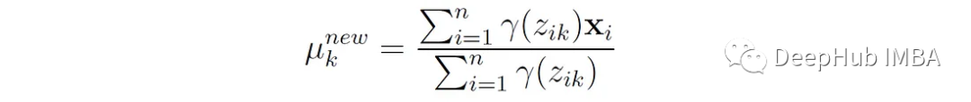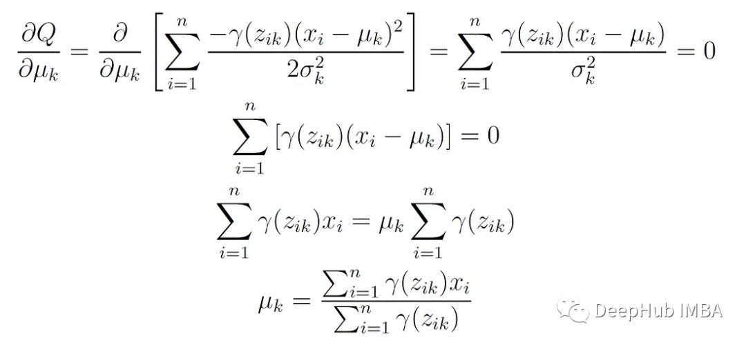 第k个分量的新平均值是所有数据点的加权平均值,权重是这些点属于分量k的概率。这个更新公式可以通过最大化期望对数似然函数Q相对于平均值μₖ而得到。