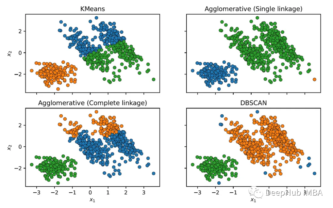可以看到,其他聚类算法不能正确识别椭圆聚类。