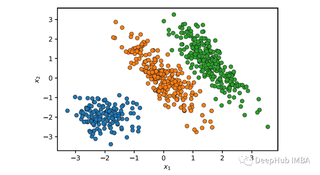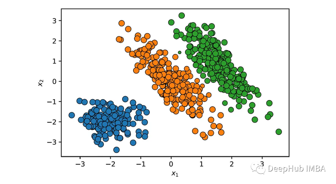 下面使用这个类对以下数据集执行聚类,该数据集由两个椭圆blobs和一个球形blobs组成: