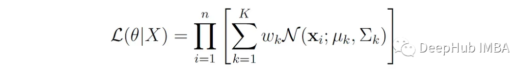 对于具有K个分量的GMM,数据集X = {X 1,…,X 1} (n个数据点),似然函数L由每个数据点的概率密度乘积给出,由GMM定义: