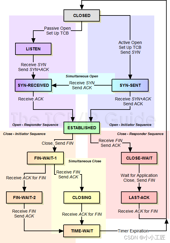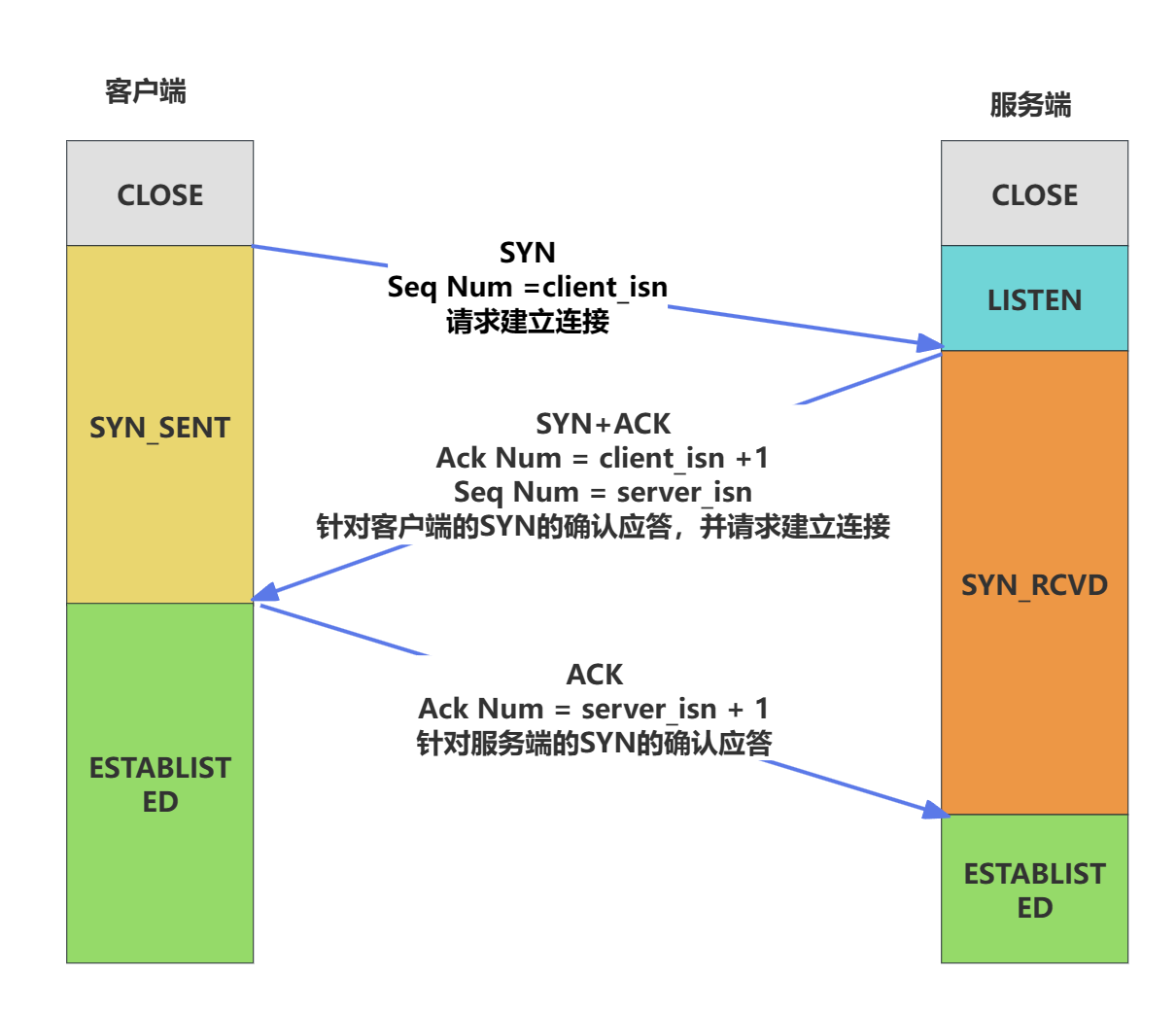 一开始,客户端和服务端都处于 CLOSE 状态。先是服务端主动监听某个端口,处于 LISTEN 状态