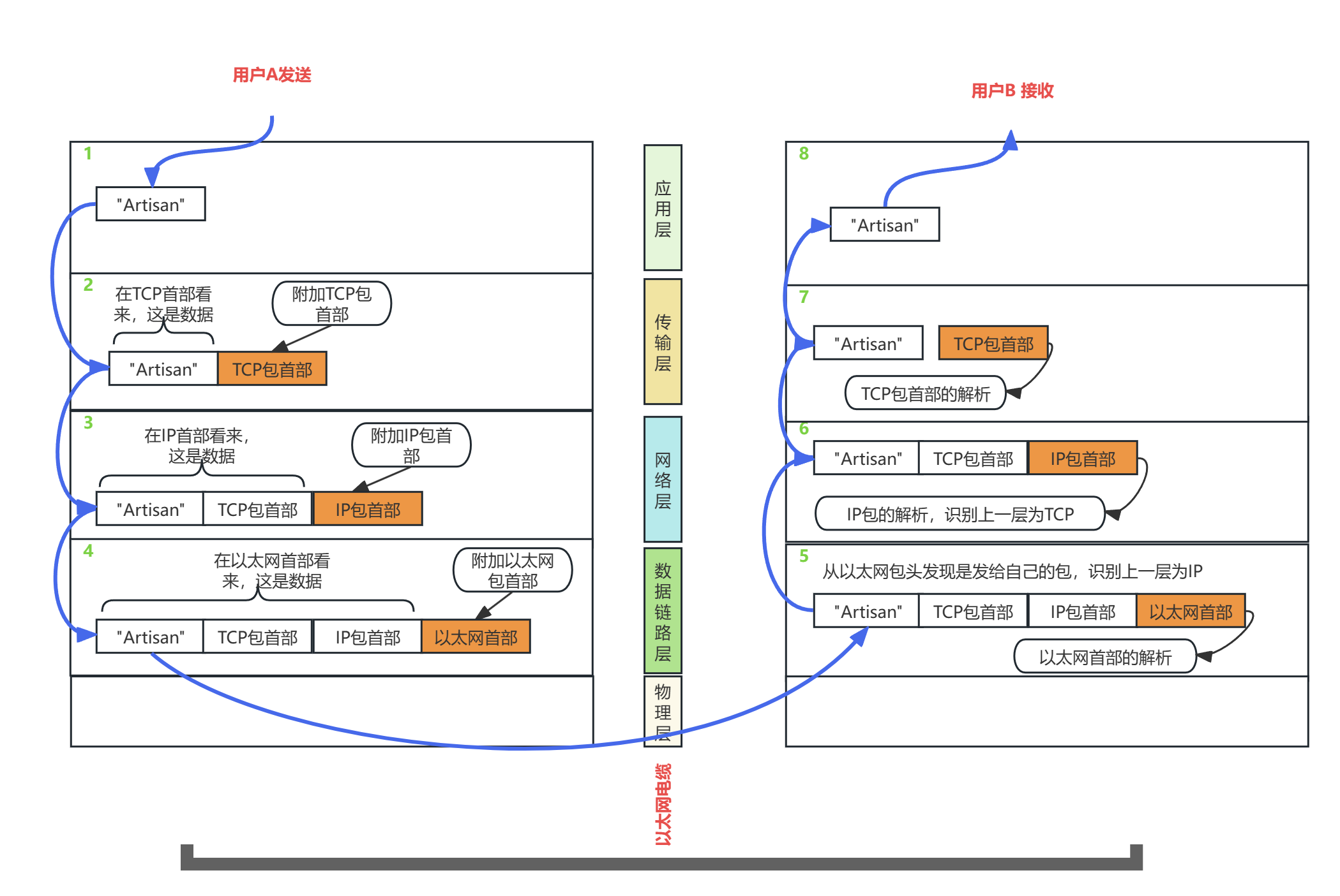 我们程序的数据首先会打到TCP的Segment中,然后TCP的Segment会打到IP的Packet中,然后再打到以太网Ethernet的Frame中,传到对端后,各个层解析自己的协议,然后把数据交给更高层的协议处理。