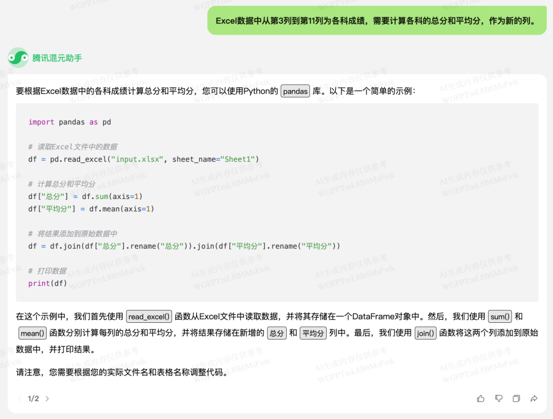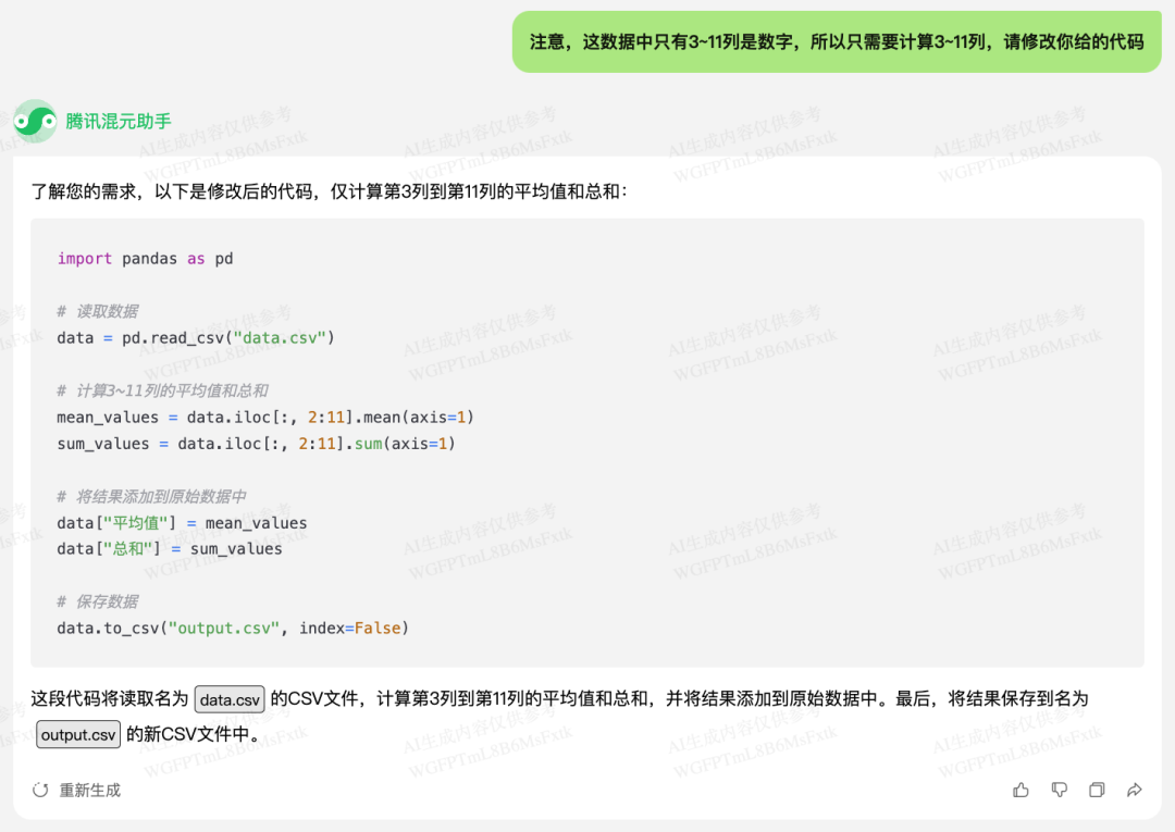 混元给出了计算总分和平均分的方法,但有点小问题,计算取的列不对。于是我再提醒它一下: