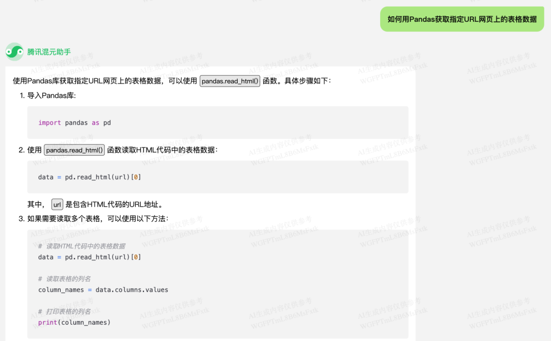 测试网页上只有一个表格,所以只需要回答中的前两个步骤就可以成功获取了。把目标 URL 代入混元给出的代码中: