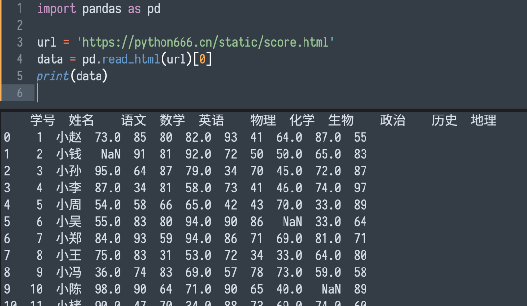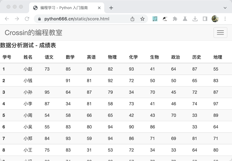 为了保证测试环境的稳定,我自己提前准备好了一份测试数据,地址为:https://python666.cn/static/score.html