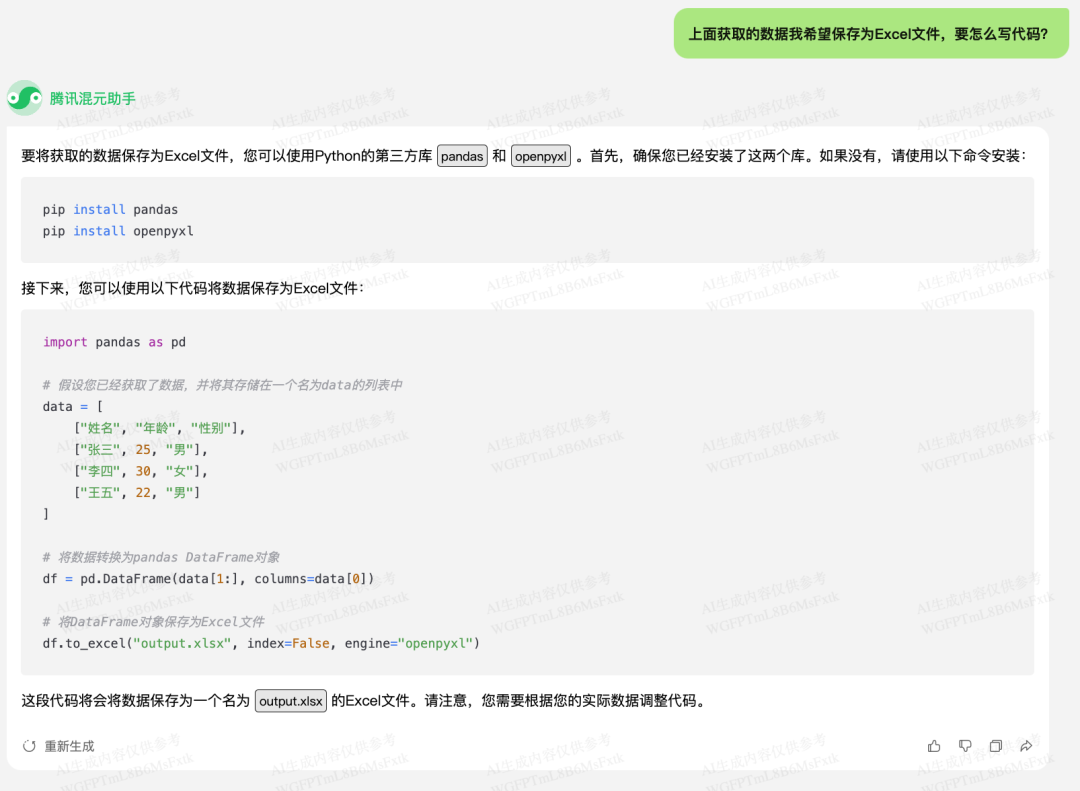 混元给出的方案是使用 pandas 的 .to_excel 方法,把它加入到我们前面的代码中: