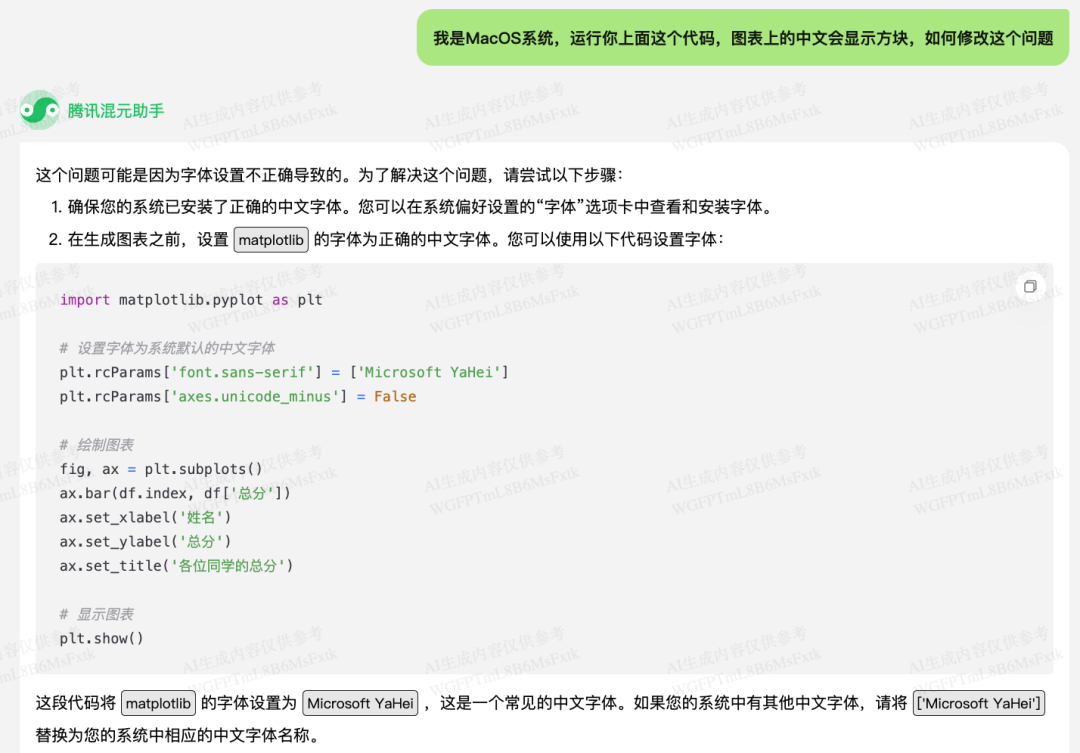 混元给出的解决方案是通过 plt.rcParams['font.sans-serif'] 设置中文字体。不过它给的 'Microsoft YaHei' 字体我电脑上没有,替换成我系统里有的 'Songti SC',确实可以解决显示问题: